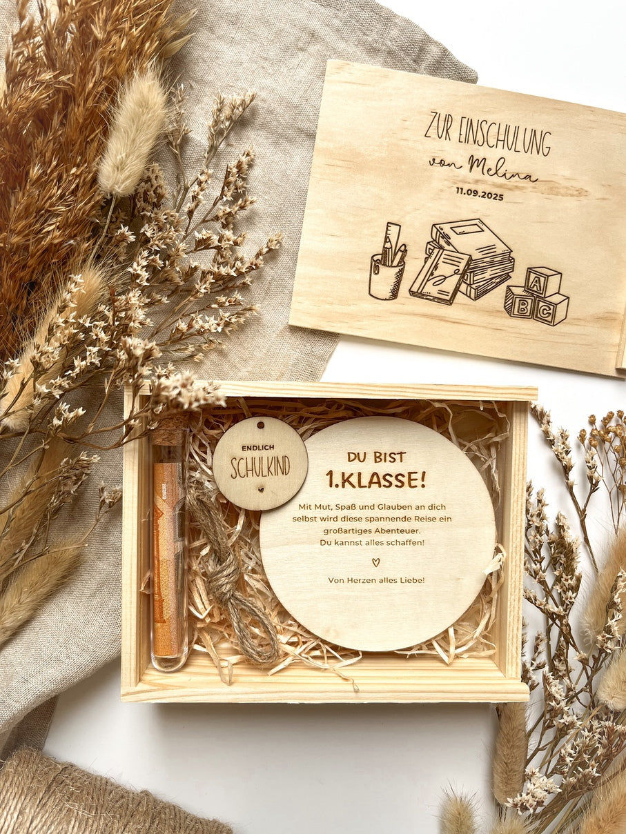 Du suchst nach einer besonderen Möglichkeit, ein Geldgeschenk zur Einschulung zu überreichen? Unsere personalisierte Holz-Geschenkbox zum Schulstart ist die ideale Lösung! Statt Geldscheine lieblos in eine Karte zu legen, kannst du deinem Einschulungsgeschenk eine persönliche und stilvolle Note verleihen – perfekt, um dem Schulkind eine Freude zu machen!