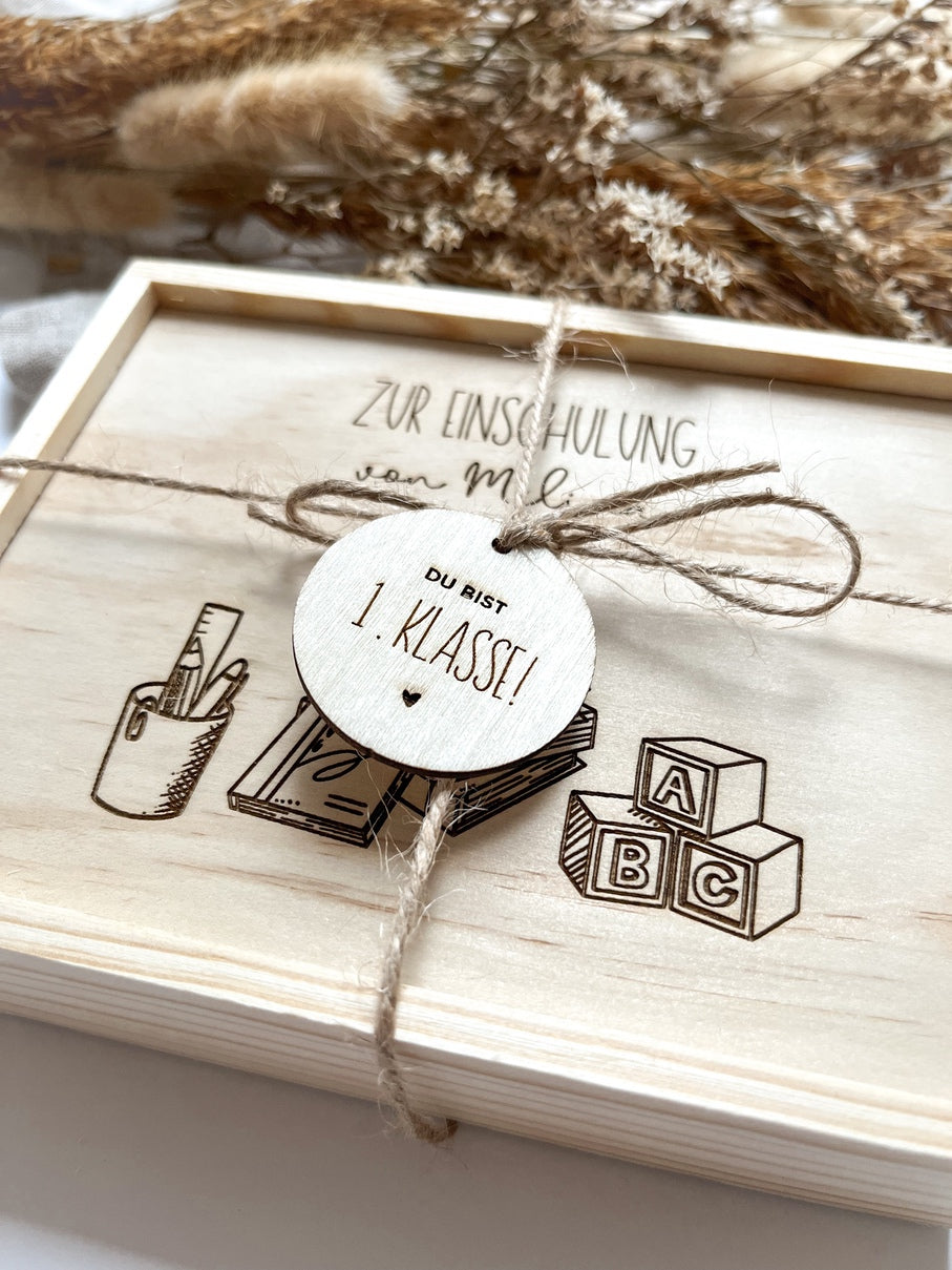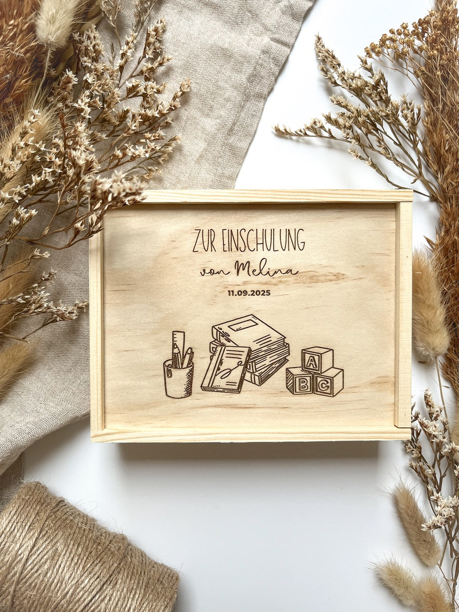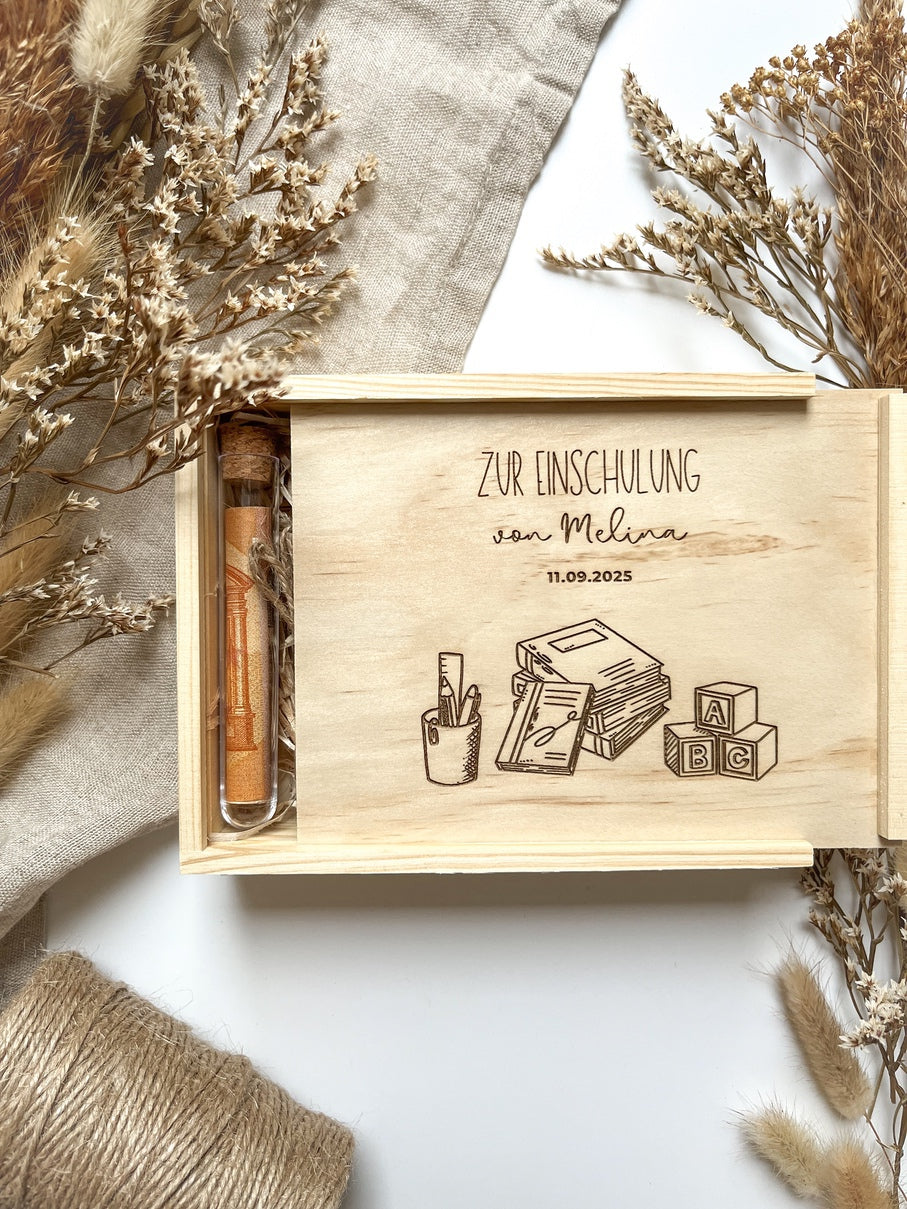 Nach der Einschulung kann die Box als stilvolle Aufbewahrung für kleine Erinnerungen oder Fotos genutzt werden – ein langlebiges Andenken an den großen Tag.