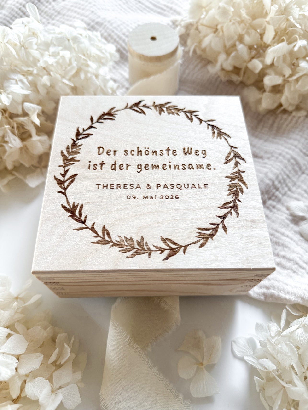 Die Klappbox aus naturbelassenem Birkenholz wird mit den Vornamen des Brautpaares und dem Hochzeitsdatum hochwertig graviert.