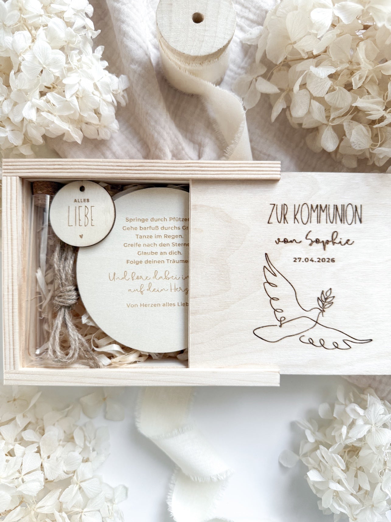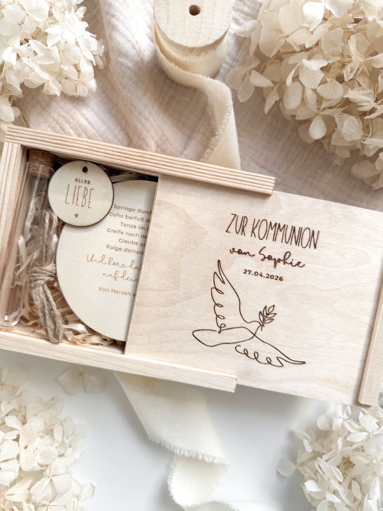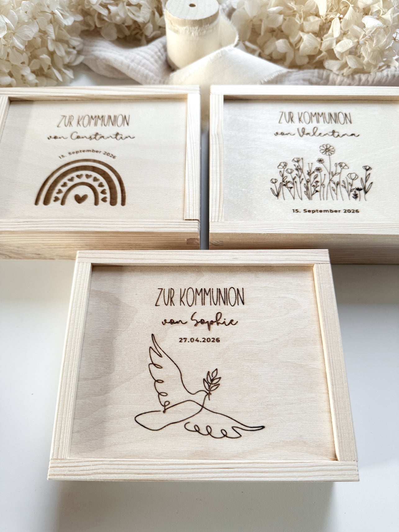 Mache dein Geschenk zur Kommunion einzigartig! Bestelle jetzt deine personalisierte Holz-Geschenkschachtel mit Gravur und überrasche mit einem Geschenk, das lange in Erinnerung bleibt 🤍