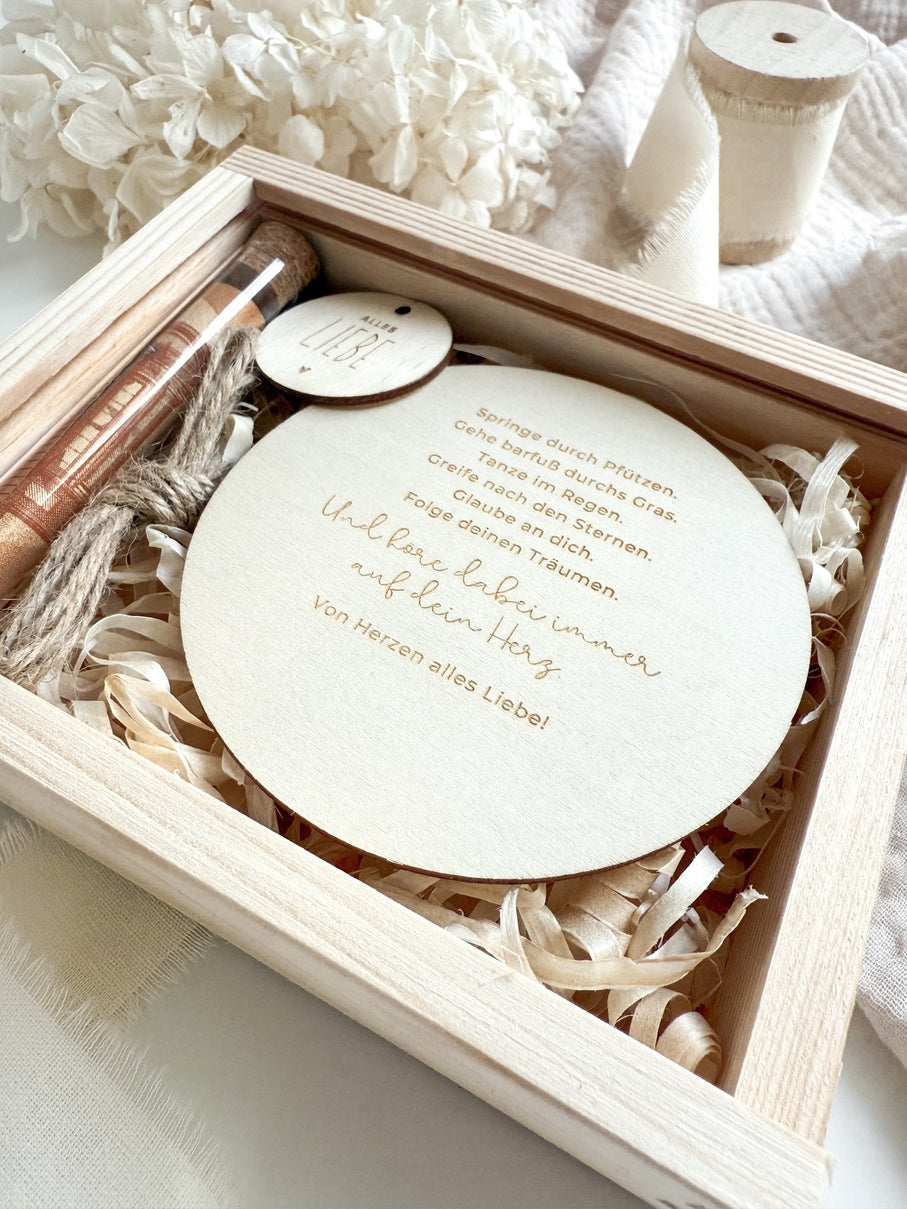 Du kannst die Schachtel optional mit einem gravierten Holzanhänger erwerben, der mit einer Juteschnur geliefert wird – ein charmantes Extra, das dein Geschenk noch einzigartiger macht.