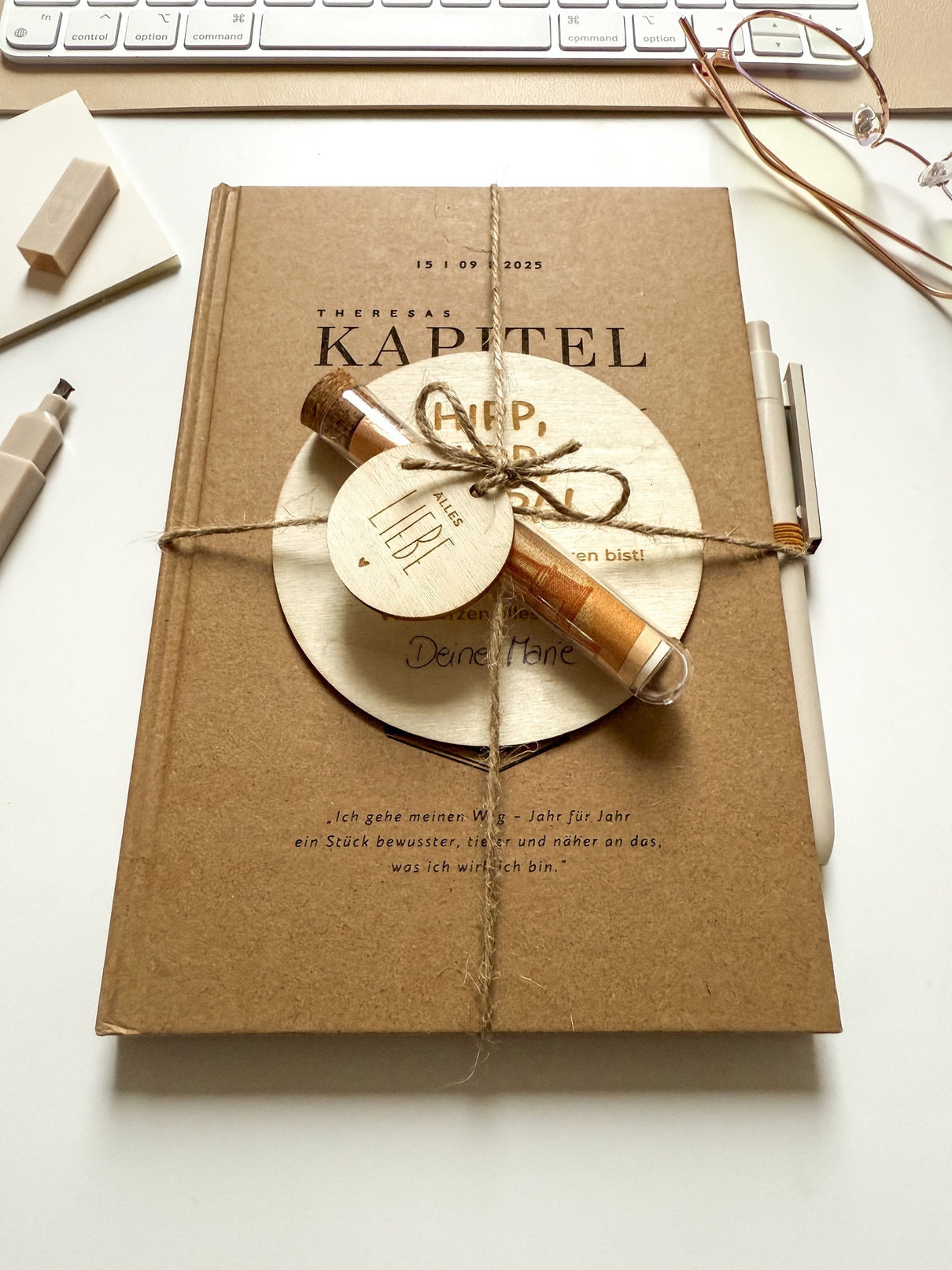 + Holzscheibe (Ø 10 cm): Wähle aus 6 liebevoll gravierten Geburtstagssprüchen – ideal zum Unterschreiben und dient als besondere Glückwunschkarte