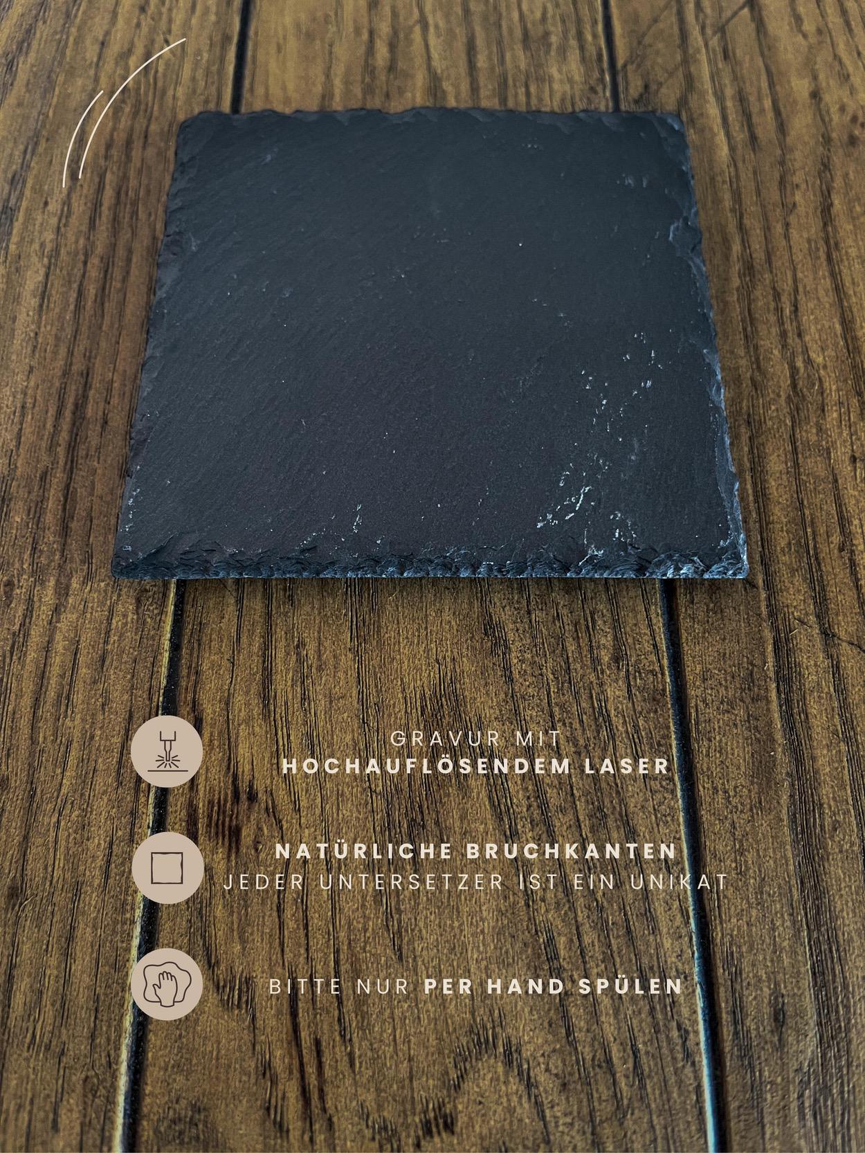 Naturbelassener Schiefer: Jeder Untersetzer ist ein Unikat und kann leicht in der Dicke und Beschaffenheit variieren. Aus diesem Grund können bei der Gravur minimale Unterschiede entstehen.