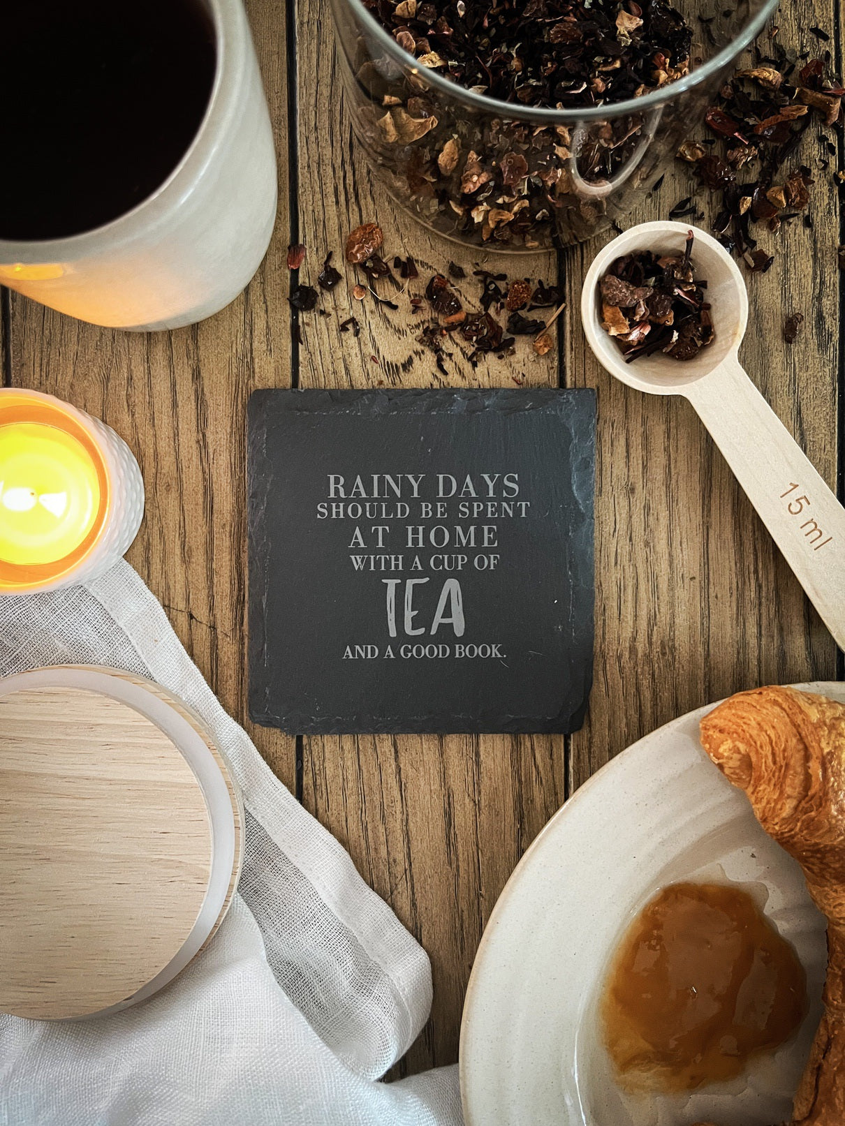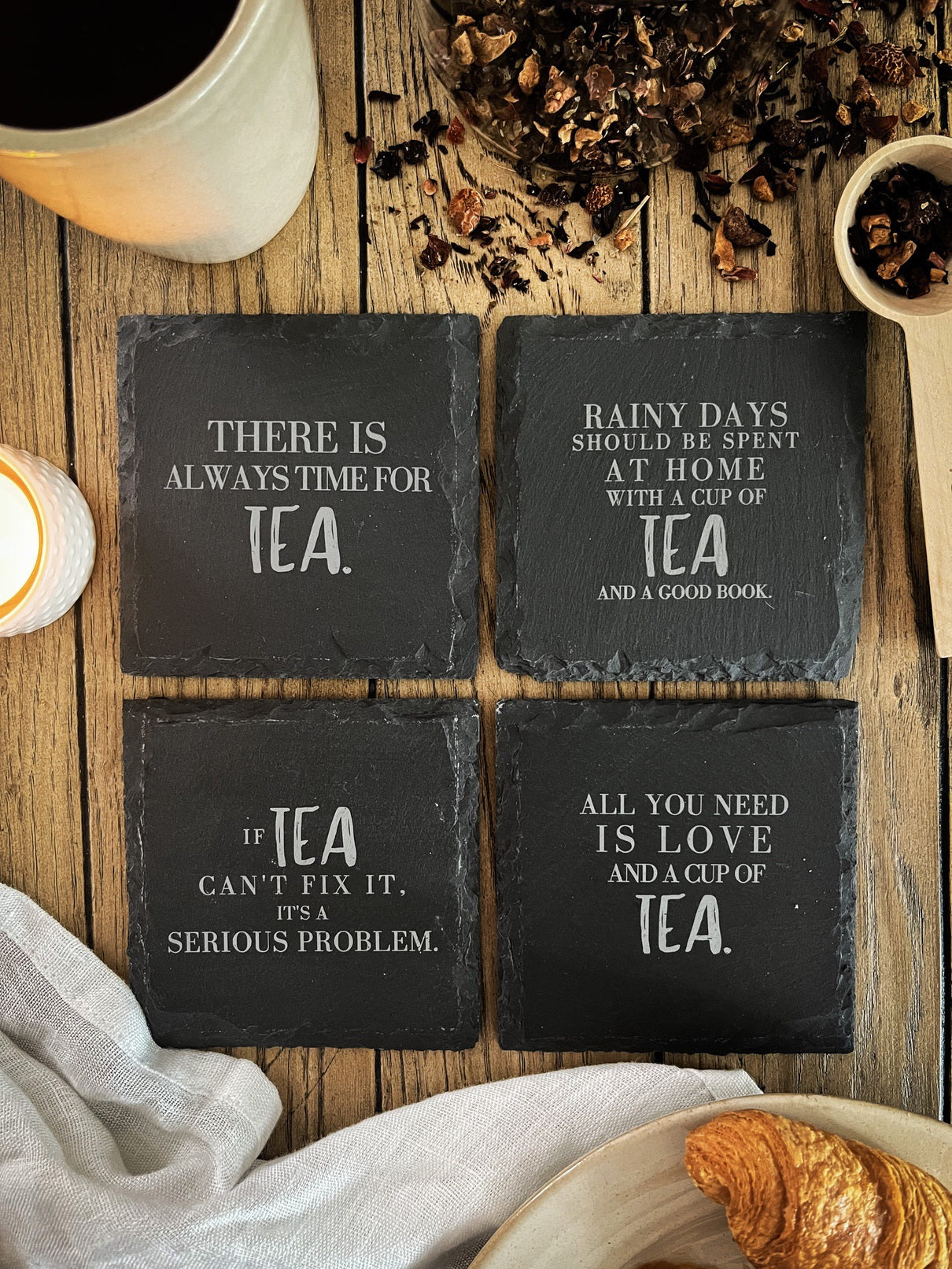 Das Set besteht aus vier Untersetzern mit verschiedenen Sprüchen zum Thema "Tee" und ist somit ein perfektes Geschenk und ein Must-have für jede/n Tee-Liebhaber/in.